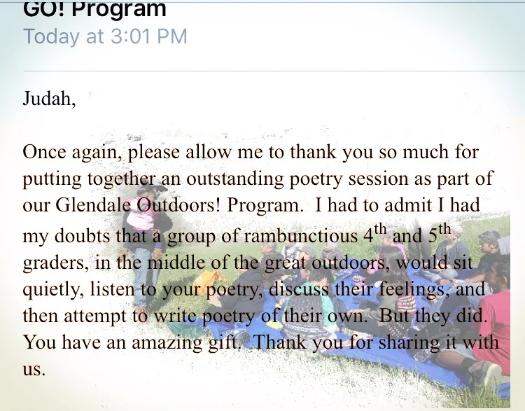 Teaching for the dA Center for the Arts opened the opportunity to Teach for the ASES Program at Pomona Unified School District. Judah became an Art Liason and Poetry Instructor for thwas District, Teaching Poetry and Holding Schoolwide assemblies and all day break out sessions at all the Pomona Jr. and High Schools. Judah also began and reinstalled several Poetry and Creative Writing Clubs at several of the High Schools that was still meeting a decade later.
